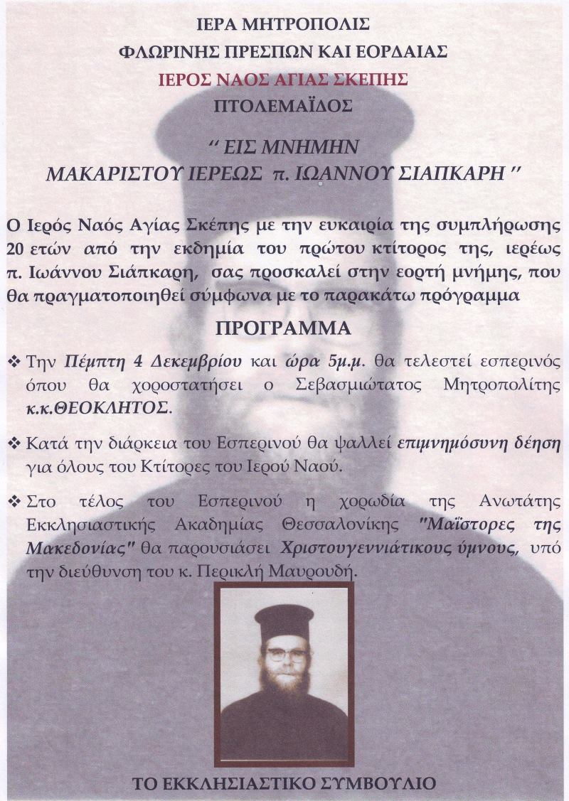 της, ιερέως π. Ιωάννη Σιάπκαρη, σας προσκαλέί στην εορτή μνήμης.