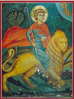 αγίου, καβάλα σ' ένα λιοντάρι και μ' ένα αρνί στα χέρια. Σύμφωνα με τη σχετική
